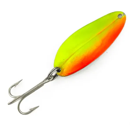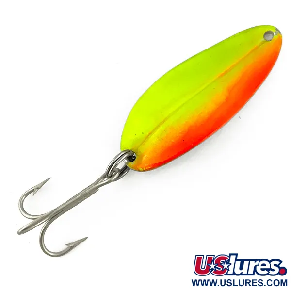 Tämä 5 cm pitkä lusikkauistin on varustettu näyttävällä kaksisävyisellä viimeistelyllä, jossa neon-chartreuse vaihtuu kirkkaan oranssiin reunaan. Tämä yksilö, tuotekoodiltaan 3706, kuuluu Toddco Main Liner UV -sarjaan, jota amerikkalaisyritys valmisti noin vuoteen 1980 asti. UV-merkintä on toiminnallinen kohokohta, sillä maali on suunniteltu hohtamaan vihreänä ja oranssina ultraviolettivalossa näkyvyyden parantamiseksi sameassa vedessä. Painoltaan 11 g (2/5 oz) oleva stansattu metallirunko on varustettu hopeanvärisellä kolmihaarakiukulla ja uistinrenkaalla. Viehe heijastaa puolivälin 1900-luvun yhdysvaltalaista alkuperäänsä ja on säilynyt erinomaisessa kunnossa (arvosana 5/5), osoittaen alkuperäistä tehdaskiiltoa ja puhtaita koukkuja.