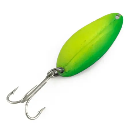 11 g:n paino antaa tälle 5 cm:n lusikkauistimelle tiheyden, jota tarvitaan tehokkaaseen heittämiseen syvempiin vesikerroksiin. Tuotekoodilla 7305 tunnistetussa TODDCO Main liner UV -uistimessa on kirkas keltaisesta vihreään vaihtuva liukuväri, joka korostaa sen yhdysvaltalaista perintöä ennen vuotta 1980. Silmiinpistävin yksityiskohta on UV-aktiivinen maali; kuten toisesta kuvasta näkyy, se reagoi voimakkaalla luminoivalla hohdolla lisäten näkyvyyttä hämärässä. Rakenne sisältää yhden kiinnityspisteen ja tukevan uistinrenkaan, johon on kiinnitetty hopeanvärinen kolmihaarakoukku. Arvosanalla 5/5 varustettu viehe on erinomaisessa kunnossa, eikä maalipinnassa tai metalliosissa ole käytön tai iän merkkejä. Hienovaraisena yksityiskohtana kuperan puolen keskellä kulkee pitkittäissuuntainen harjanne, joka kapenee tasaisesti kohti koukun silmukkata.
