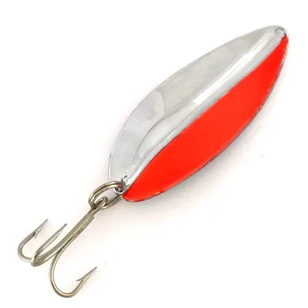 Nikkeli ja punainen hallitsevat tämän perinteisen lusikan pintaa. Kyseessä on TODDCO Main liner UV, joka painaa 21g (3/4oz). Malli 7518 on valmistettu Yhdysvalloissa ennen vuotta 1980, ja siinä on vankka rakenne, joka on suunniteltu heittokalastukseen tai uisteluun. Silmiinpistävin ominaisuus on sen UV-reaktiivisuus; nikkelipuoli tarjoaa voimakkaan metallisen välkkeen, kun taas punainen puoli on käsitelty fluoresoivalla pinnoitteella, joka hehkuu syvän oranssina ultraviolettivalossa. Tämä kahden kontrastin yhdistelmä on suunniteltu maksimoimaan näkyvyys eri syvyyksissä. Pituudeltaan 6,5 cm (2 1/2") uistin on varustettu tukevalla alkuperäisellä kolmihaarakiukulla. Se on erinomaisessa kunnossa (arvosana 5/5) puhtaiden pintojen ja kulumattomuuden ansiosta. Vankka uistinrengas korostaa TODDCO:n tuotantokaudelle tyypillistä kestävää laatua.