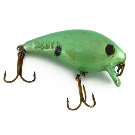 1/4 unssin (7 g) paino antaa tälle pintauuistimelle tarkan heittotarkkuuden tiheän kasvuston sekaan. Tämä 2 1/4" (6 cm) pituinen viehe on viimeistelty helmiäishohtoisella Green / Black -värityksellä ja kyljestä löytyy tunnistettava "BABY"-kohokuviointi. Mann's Bait suunnitteli tämän mallin pysymään vesipatsaan yläosassa, saavuttaen enintään vain 0,3 metrin (1 ft) syvyyden. Muotoiluun kuuluu ainutlaatuinen silmäkuvio hienoin säteittäisin viivoin sekä yksi musta sivupiste, mikä on tyypillistä USA:n vintage-tuotantosarjoille. Kaikki alkuperäiset varusteet ovat tallella, mukaan lukien kaksi tukevaa kolmihaarakoukkua ja uistinrengas, ansaiten tälle kohteelle kuntoluokituksen 5/5. Tuotekoodi 9711 on valettu lyhyellä ja jyrkällä uintilevyllä, joka rajoittaa sukellusta säilyttäen silti kelluvuuden.