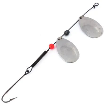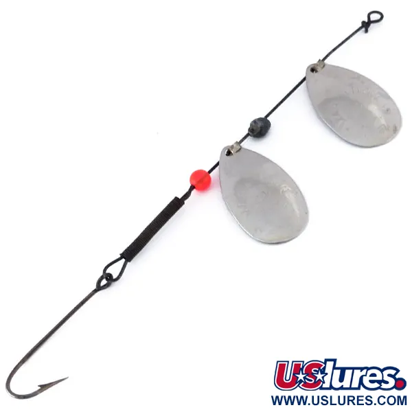Nikkelipinnoite peittää tämän 12,0 cm (4 3/4") pituisen tandem-lipan lehdet, mikä varmistaa kirkkaan välkkeen vaihtelevissa vesiolosuhteissa. Painoltaan 3,4 g (1/8 oz) oleva viehe on rakennettu tummaan lankarunkoon, ja siinä on punainen helmi, joka toimii iskupisteenä alemman lehden ja koukun välissä. Tandem-rakenne hyödyntää kahta kyynelmuotoista lehteä pinta-alan maksimoimiseksi säilyttäen silti hoikan profiilin heitto- tai uisteluun. Perään on kiinnitetty teräväkärkinen yksihaarakoukku, jota on vahvistettu mustalla holkilla vakauden parantamiseksi. Tuotekoodilla 10143 varustettu Marathon-viehe on valmistettu Yhdysvalloissa kestävyyttä painottaen. Kuntoarvio on 4/5, ja metallipinta on hyvin säilynyt ja osat puhtaat. Edessä oleva lankasilmukka mahdollistaa suoran solmun tai pienen lukon käytön.