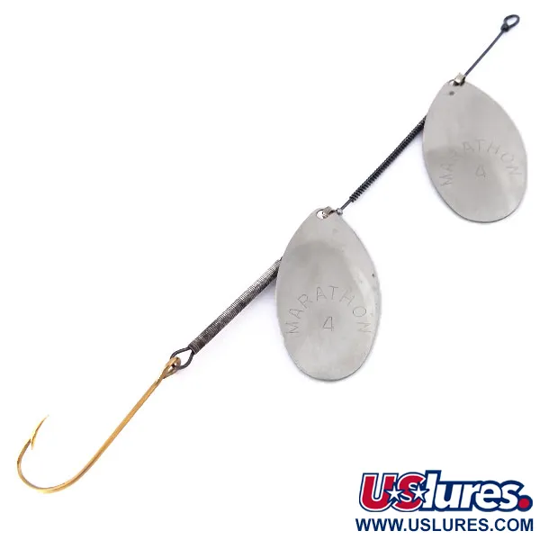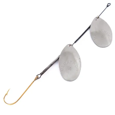 Kaksi pisaranmuotoista, numerolla 4 leimattua lippaa luonnehtivat tätä Marathon Bait Companyn klassista nikkelöityä lippauistinta. Kokonaispituudeltaan 15 cm (6") pitkässä mallissa, tuotekoodiltaan 10476, on kirkas nikkeliviimeistely, joka on säilynyt huomattavan puhtaana. Painoltaan 7 g (1/4 oz) viehe on rakennettu tummaan lankarunkoon, jonka perässä on yksittäinen kullanvärinen koukku. Pieni, läpikuultava punainen helmi on sijoitettu lippaholkkien väliin, tarjoten hienovaraisen visuaalisen kontrastin metalliosille. Tämä Wisconsinissa valmistettu viehe edustaa vuosina 1929–1979 toimineen valmistajan puolivälin aikakautta. Metalliosat ovat erinomaisessa kunnossa (arvosana 5/5), mikä näkyy langan hyvässä kunnossa ja lippojen selkeissä leimoissa. Jokainen osa, langan kierteistä kaksoislipparakenteeseen, on tyypillinen kestävälle muotoilulle, jota yritys tuotti 50-vuotisen historiansa aikana Yhdysvaltain Keskilännessä.