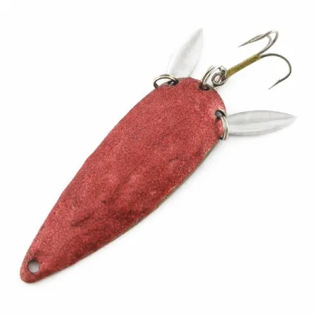Tämä 17 gramman (3/5 unssia) painoinen Marathon-lusikkauistin on varustettu erottuvalla pintakuvioidulla punaisella kimalleviimeistelyllä, joka luo kontrastin sen kiillotetun metallisen kääntöpuolen kanssa. Uistimen pituus on 7,5 cm (3 tuumaa), ja sen rakenteeseen kuuluu kaksi hopeanväristä pajunlehtilippaa, jotka on kiinnitetty uistinrenkailla peräpäähän. Tämä ovela ominaisuus lisää välkettä ja kätkee kolmihaarakoukun. Tämä nimenomainen malli, tuotekoodiltaan 24180, on peräisin wisconsinilaiselta Marathon Bait Companylta, joka oli merkittävä valmistaja vuosina 1929–1979. Lisälipat tuovat uistimen takaosaan visuaalista mielenkiintoa jäljitellen pyrstöevän liikettä. Nykyisessä 4/5-kunnossaan viimeistely on säilynyt kirkkaana ja osat ovat tiukasti kiinni. Uistinrenkaat ja kolmihaarakoukku osoittavat vuosisadan puolivälin amerikkalaiselle kalastusvälinevalmistukselle tyypillistä kestävyyttä.