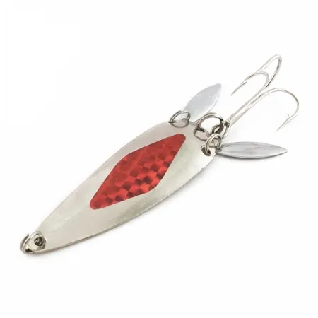 Kaksi pientä hopeista lippaa seuraa kromirunkoa, tarjoten lisävälkettä ja visuaalista liikettä suoraan ottialueella. Heijastavassa pinnassa on punainen suomukuvioinen timantti-insertti keskellä kuperaa puolta, mikä takaa hyvän näkyvyyden pinnan alla. 3 tuuman (7,5 cm) pituudellaan ja 17 gramman (3/5 oz) painollaan painonjakauma soveltuu erinomaisesti pitkiin heittoihin tai tasaiseen uisteluun. Tämän mallin on valmistanut Marathon Bait Company vuosina 1929–1979, ja siinä yhdistyvät lusikkauistimen profiili ja lisälippojen aiheuttama häiriö. Tämä yksilö on 5/5-kunnossa, ja heijastava viimeistely sekä punainen suomutarra ovat puhtaat ja ehjät. Tuotekoodi 24602.