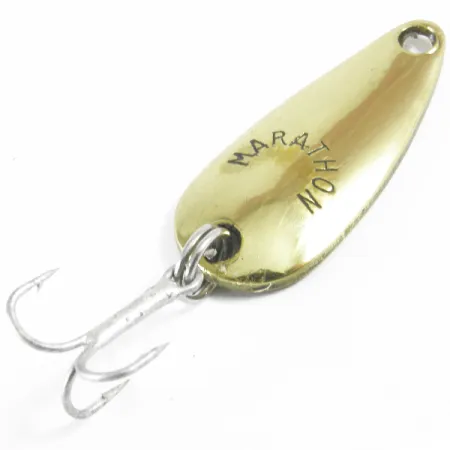Koveraan metallipintaan selkeästi meistetty Marathon-nimi on wisconsinilaisen käsityötaidon tunnusmerkki yritykseltä, joka valmisti kalastustarvikkeita puolen vuosisadan ajan. Tässä 3 cm (1 1/4") lusikkauistimessa on kiillotettu kultaviimeistely, joka säilyy kirkkaana sen pisaranmuotoisessa rungossa. Painoltaan 4 g (1/8 oz) uistin on varustettu hopeanvärisellä kolmihaarakoukulla, joka on kiinnitetty tukevalla uistinrenkaalla alaosaan. Tuotekoodi 3640 tunnistaa tämän yhdysvaltalaisvalmisteisen yksilön, joka heijastaa Marathon Bait Companyn valmistushistoriaa vuosina 1929–1979. Metallipinta on erinomaisessa 5/5-kunnossa ja säilyttää puhtaan ja heijastavan ulkonäön sekä etu- että kääntöpuolella. Kärkeen porattu tarkka reikä toimii siiman tai leikarin kiinnityspisteenä.