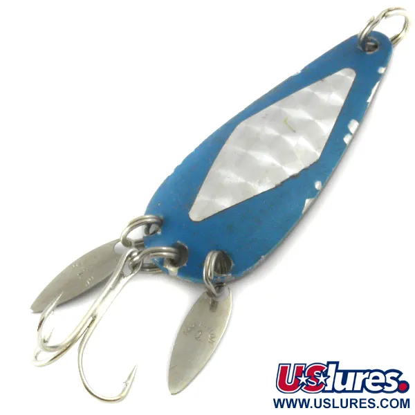 Nikkeli- ja sininen viimeistely määrittelee tämän Marathon Bait Companyn 6 cm (2 1/4") lusikkauistimen visuaalisen ilmeen. Wisconsinissa vuosina 1929–1979 toiminut Marathon valmisti tämän kaltaisia innovatiivisia malleja, joissa on kaksi pientä, liikkuvaa "Sonic Blades" -lehteä takaosassa. Nämä pitkänomaiset nikkelilehdet on kiinnitetty uistinrenkaisiin luomaan illuusion syöttikalan pyrstöstä peittäen samalla osittain terävän kolmihaarakoukun. Painoltaan 12 g (2/5 oz) olevan uistimen kääntöpuolelle on stanssattu valmistajan nimi, mikä osoittaa sen alkuperän olevan USA:sta. Lusikan etupuolella on kuvioitu timanttikuvioinen upotus, joka erottuu maalatusta sinisestä reunuksesta. Tuotekoodilla 4130 listattu yksilö on 4/5-kunnossa, ja siinä on hyvin säilyneet metalliosat sekä eloisat värit, jotka heijastavat sen historiaa vuosisadan puolivälin kalastusklassikkona. Nokan uistinrengas tarjoaa kalastajalle turvallisen kiinnityspisteen.