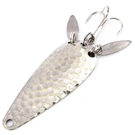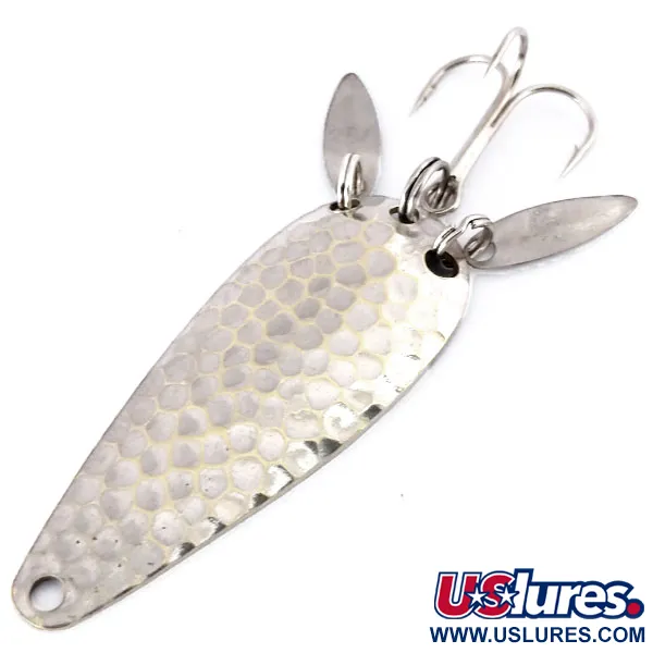 Vasaroitu nikkelipinnoite heijastaa valoa tämän 6 cm (2 1/4") lusikkauistimen kuvioidulta pinnalta. Terävän kolmihaarakoukun lähelle on asennettu kaksi pientä, pitkänomaista sonic-lippaa, jotka pyörivät uistinrenkaissa. Nämä lisälehdet palvelevat visuaalista tarkoitusta peittäen koukkukiinnityksen ja luoden vaikutelman liikkuvasta pyrstöevästä. Tässä yksilössä on stanssattu "MARATHON"-leima kiillotetulla kääntöpuolella merkkinä Wisconsinissa toimineesta valmistajasta, joka toimi viiden vuosikymmenen ajan vuodesta 1929 alkaen. Uistin painaa 12 g (2/5 oz), mikä antaa sille hyvän painon tarkkoihin heittoihin. Tuotekoodilla 10044 tunnistettava lusikka on säilyttänyt alkuperäisen loistonsa ja rakenteellisen kuntonsa, vastaten kuntoluokitusta 5/5.