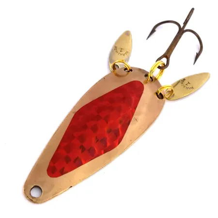 Punaisesta prismaattisesta upotuksesta heijastuvat valonvälähdykset kiinnittävät välittömästi huomion tähän 10275-yksilöön. Painoltaan 12g (2/5oz) oleva lusikkauistin on varustettu perinteisellä pisaranmuotoisella profiililla ja sen kuperalla puolella on upea kupariviimeistely. Peräosaan on kiinnitetty uistinrenkailla kaksi pitkänomaista minilippaa — joita usein kutsutaan sonic-lavoiksi — jotka tuovat lisää visuaalista houkuttelevuutta ja auttavat samalla kätkemään terävän kolmihaarakoukun. Näihin pieniin kullanvärisiin koristeisiin on lyöty merkin tunniste, mikä toistaa rungon 6cm (2 1/4") kiillotetulla koveralla puolella olevaa selkeää "MARATHON"-leimaa. Tämä viehe on peräisin Wisconsinin Marathon Bait Companysta, joka oli Amerikan kalastusvälineteollisuuden voimatekijä vuosina 1929–1979. Kupari/Puna-väriyhdistelmä on säilynyt hyvin, ja kaikki osat ovat erinomaisessa kunnossa. Tämä viehe saa kuntoluokituksen 5/5, ja se näyttää lähes yhtä uudelta kuin päivänä, jona se lähti Wisconsinin tehtaalta.
