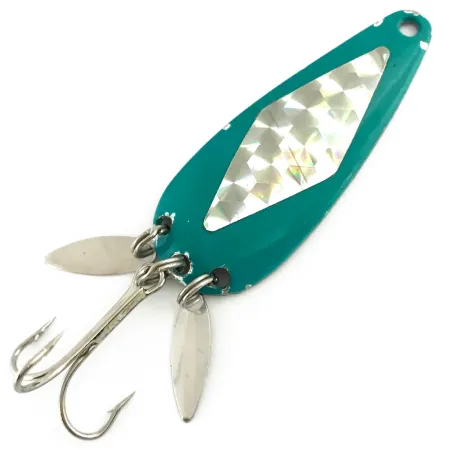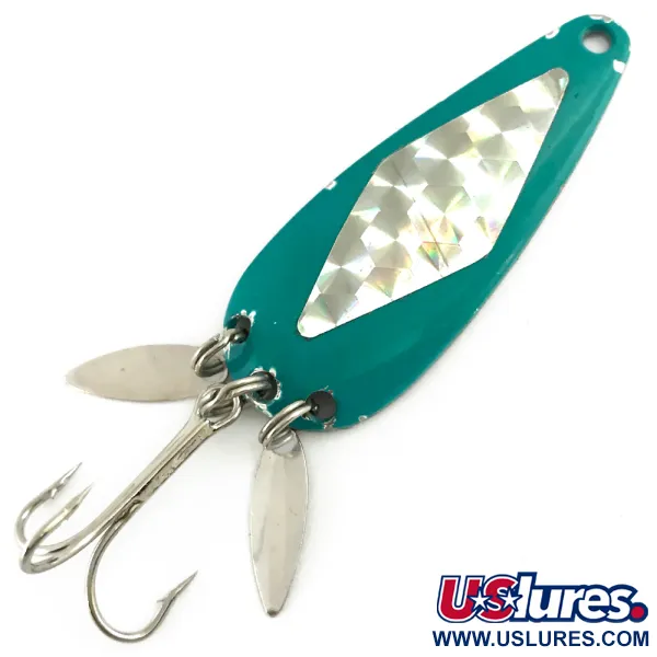 Marathon Bait Companyn vintage-lusikkauistimen tunnusomaisia piirteitä ovat turkoosinsininen maalipinta ja prismaattinen timanttikuvio. Kaksi pitkänomaista hopeista pikkulippaa on kiinnitetty takapuolen uistinrenkaaseen kolmihaarakoukun rinnalle, tarkoituksena tarjota lisävälkettä ja visuaalista ärsykettä kelauksen aikana. Tämä yksilö, tuotekoodiltaan 5640, on pituudeltaan 6 cm (2 1/4") ja painoltaan 12 g (2/5 oz). Uistimen kääntöpuolella on puhdas, kiillotettu metallipinta, jossa on klassinen MARATHON-valmistajaleima – Wisconsinissa vuosina 1929–1979 toimineen yrityksen tavaramerkki. Maali ja heijastava tarra ovat erinomaisessa kunnossa (arvosana 5/5). Metalliosat ja lipat ovat täysin korroosiovapaita, mikä tekee tästä hienon esimerkin vuosisadan puolivälin amerikkalaisesta uistinvalmistuksesta.