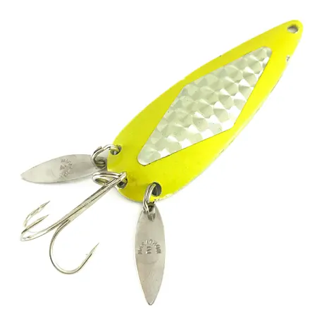 Tämän 7,5 cm (3") pituisen lusikkauistimen runko on päällystetty fluoresoivalla keltaisella maalilla, mikä takaa erinomaisen näkyvyyden syvissä tai sameissa vesissä. Uistin painaa 17 g (3/5 oz), ja siinä on kuvioitu nikkelinen timantti-insertti valon heijastamiseksi. Keltainen viimeistely reagoi selkeällä hohdolla altistuessaan UV-valolle. Marathon Bait Company, joka toimi Wisconsinissa vuosina 1929–1979, lisäsi kaksi pientä pajunlehden muotoista "sonic blades" -lippaa uistimen takaosaan. Nämä nikkeliviimeistellyt lipat peittävät hopeisen kolmihaarakoukun ja tuovat lisävälkettä kelauksen aikana. Tämä yksilö, tuotekoodiltaan 6260, on 5/5-kunnossa ja sisältää kaikki alkuperäiset osat. Lippojen leimatut merkinnät vahvistavat sen olevan peräisin Marathon Bait Companyn mallistosta.