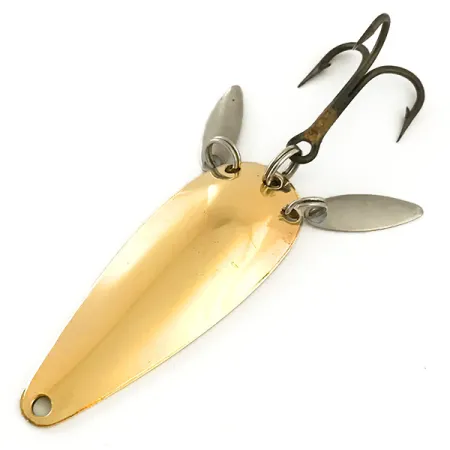 Kullattu metalli muodostaa pohjan tälle 6 cm (2 1/4 tuumaa) pitkälle lusikkauistimelle, joka on hieno esimerkki vuosisadan puolivälin amerikkalaisesta käsityöstä. Kaksi hopeanväristä äänilevyä on kiinnitetty takimmaiseen uistinrenkaaseen kolmihaarakoukun viereen. Ne on suunniteltu heijastamaan valoa ja antamaan visuaalista ärsykettä iskun lähellä. Sisäpinnan koveraan puoleen on leimattu selvästi Marathon-nimi, joka on Wisconsiniin sijoittuneen, osavaltion kalastusvälinetuotantoa vuosina 1929–1979 johtaneen yrityksen merkki. Tämä nimenomainen yksilö, tuotekoodi 6286, painaa 12 g (2/5 oz) ja on 5/5-kunnossa. Rakenteessa on leveä siimasilmukka kärjessä, mikä sopii paksulle monofiilisiimalle tai perukkeelle. Kolmihaarakoukun tummempi viimeistely tarjoaa jyrkän kontrastin lusikan kiillotetulle kullalle.