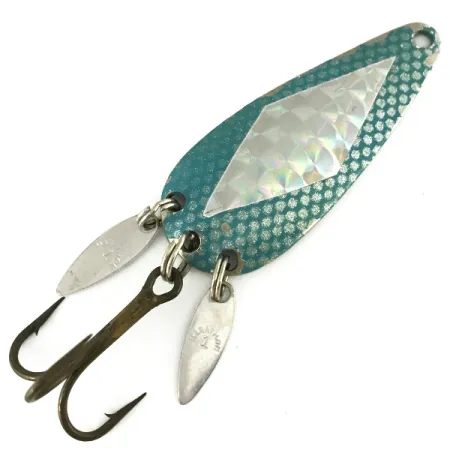 Tämä 12 g (2/5 oz) painoinen lusikkauistin on varustettu erottuvalla sinisellä suomukuviolla, joka ympäröi keskellä olevaa holografista timantti-inserttiä. Tuotekoodilla 7111 luettelosta löytyvä uistin on pituudeltaan 6 cm (2 1/4 tuumaa) ja se edustaa wisconsinilaisen Marathon Bait Companyn ainutlaatuista muotoilufilosofiaa. Yritys valmisti kalastustarvikkeita menestyksekkäästi viidenkymmenen vuoden ajan vuosina 1929–1979. Tämä yksilö on heidän erityinen muunnelmansa, jossa uistinrenkaaseen on kiinnitetty kaksi pitkänomaista hopeista minilevyä. Nämä äänilevyt on sijoitettu kolmihaarakoukun viereen heijastamaan valoa ja jäljittelemään syöttikalan pyrstön liikettä. Uistimen etupuoli on voimakkaasti kuvioitu, kun taas takapuoli on viimeistelty puhtaalla, kiillotetulla nikkelillä. Pieniin äänilevyihin on selkeästi meistetty Marathon-nimi, mikä on keräilijöille luotettava merkki aitoudesta. Etupuolen viimeistely on hyvin säilynyt ja kiinnikkeet ovat edelleen vahvat, mikä antaa tälle vintage-uistimelle kuntoluokituksen 4/5. Se on hieno esimerkki vuosisadan puolivälin amerikkalaisesta valmistuksesta, jossa yhdistyvät teksturoitu sinivihreä runko ja valoa heijastavat elementit iskujen houkuttelemiseksi.