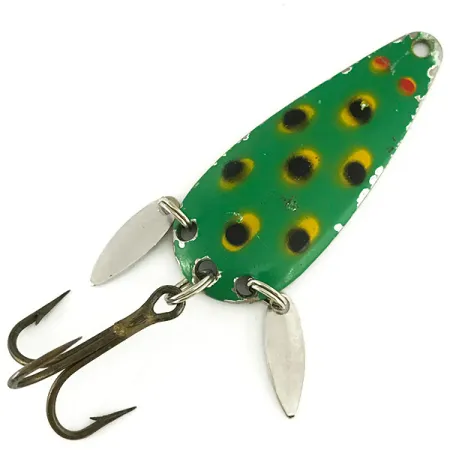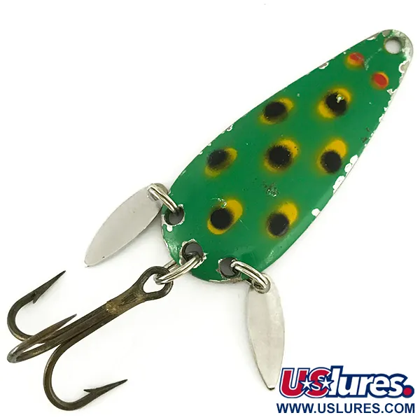 Vihreät ja keltaiset täplät perinteisessä sammakkokuviossa koristavat tämän 6 cm (2 1/4") lusikkauistimen yläpintaa. Kiillotetun nikkelisen alapuolen selkeä leima kertoo nimen Marathon, joka oli Wisconsinin uistinkulttuurin kulmakivi Wausausta käsin vuosina 1929–1979. Tämän tuotekoodilla 7156 tunnistetun 12 g (2/5 oz) yksilön perään, uistinrenkaaseen, on kiinnitetty kaksi erottuvaa hopeanväristä sonic-lippaa. Nämä pitkänomaiset minilipat on sijoitettu heijastamaan valoa ja kätkemään tummapintainen kolmihaarakoukku heiton tai uistelun aikana. Yksilö on siistissä kunnossa, emalissa on vain minimaalista kulumista, ja se ansaitsee arvosanan 5/5.