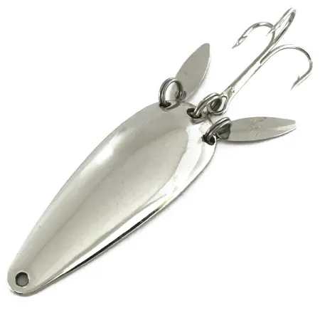 Kiillotettu nikkelöinti peittää tämän klassisen 6 cm (2 1/4") lusikkauistimen rungon, mikä on osoitus Marathon Bait Companyn ammattitaidosta sen 50-vuotisen historian aikana Wisconsinissa. Uistin painaa 12 g (2/5 oz) ja siinä on ainutlaatuinen rakenne, jossa kaksi pientä, pisaranmuotoista sonic-lippaa on kiinnitetty uistinrenkailla koukun lähelle. Näillä lisälipoilla on kaksi tarkoitusta: ne lisäävät välkettä profiiliin ja peittävät osittain suuren kolmihaarakoukun jäljitellen paremmin pakenevaa syöttikalaa. Tuotekoodilla 7269 tunnistettava malli edustaa sitä kekseliästä suunnittelua, joka teki Marathonista hallitsevan amerikkalaisen valmistajan vuosina 1929–1979. Kunto on erinomainen 5/5; metallipinnat ovat kirkkaat ja stansatut yksityiskohdat tarkat. Kapeassa päässä oleva siiman kiinnitysreikä täydentää pisaramuotoilun, joka on suunniteltu heittokalastukseen tai uisteluun erilaisissa makean veden olosuhteissa.