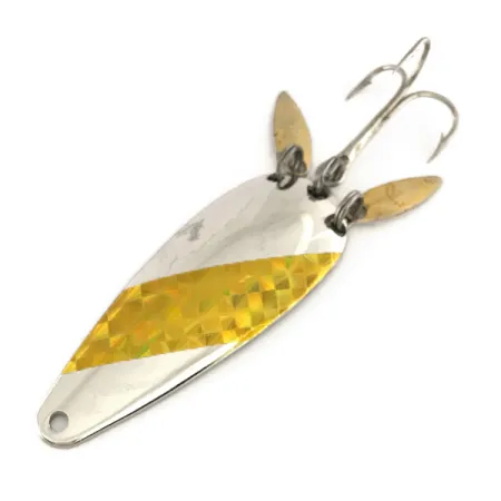 Tässä vintage-lusikkauistimessa on erottuva kultainen holografinen vinoraita kiillotetun nikkelirungon päällä, mikä korostaa Marathon Bait Companyn luovaa muotoilua. Wisconsinissa vuosina 1929–1979 toiminut valmistaja varusti tämän 7546-mallin ainutlaatuisella kaksoislippakokoonpanolla perässä. Kaksi pientä, kullanväristä willow-mallista lippaa on kiinnitetty uistinrenkaaseen kolmihaarakoukun rinnalle, mikä lisää välkettä pyrstöosaan. Painoltaan 12 g (2/5 oz) ja pituudeltaan 6 cm (2 1/4") oleva uistin on erinomaisessa 5/5-kunnossa, ja heijastava teippi sekä metallipinta ovat säilyneet erittäin hyvin. Meistetyn metallin kääntöpuolella on puhdas, sileä hopeapinta, joka on tyypillistä tälle aikakaudelle Yhdysvalloissa valmistetuille kalastusvälineille.