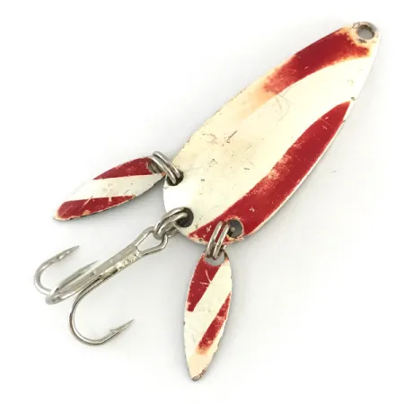 Punavalkoiset vinoraidat muodostavat hyvin erottuvan kuvion tämän 4,5 cm (1 3/4") lusikkauistimen etupuolelle. Niklatun alapuolen Marathon-stanssaus on merkki Wisconsinissa vuosina 1929–1979 toimineesta yrityksestä. Tämän nimenomaisen mallin tuotekoodi on 8200, ja se tunnistetaan pyrstön kahdesta sonic-lipasta. Nämä kaksi pientä, pitkänomaista metallilehteä välkkyvät kolmihaarakoukun lähellä, tuottaen lisävälkettä ja häivyttäen koukun sivuprofiilia. Painoltaan 8g (1/4oz) uistin on tasapainotettu monipuoliseen heittokalastukseen. Kuntoarvio on 4/5; maalipinnassa on lievää ikääntymistä, mutta alla oleva nikkeliviimeistely on yhä kirkas. Tukevasti kiinnitetyt osat pitävät lipat ja koukun paikoillaan säilyttäen tämän amerikkalaisvalmisteisen vieheen alkuperäisen kokoonpanon.
