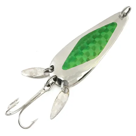 Nikkelöinti tarjoaa klassisen pohjan tälle 12 gramman painoiselle, Wisconsinissa valmistetulle lusikkauistimelle, jonka keskellä kulkee erottuva vihreä holografinen suomukuvio. Tämä tuotekoodilla 8582 tunnistettava yksilö edustaa innovatiivista muotoilua, jota Marathon Bait Company käytti valmistusvuosinaan 1929–1979. Kaksi pientä, hopeanväristä willow-mallista sonic-lippaa on kiinnitetty uistinrenkaaseen kolmihaarakoukun rinnalle. Ne on suunniteltu tuottamaan värinää ja valonheijastuksia samalla kun ne peittävät koukun kärjen. Pituudeltaan 6 cm uistin on 5/5-kunnossa, säilyttäen kiillotetun metallinhohtonsa ja prismaattisen vihreän tarran terävät reunat. Rakenteeltaan uistin on jämäkkä ja edustaa tyypillistä puolivälin vuosisadan amerikkalaista käsityötä Marathonin tehtaalta. Nämä apulipat matkivat saaliskalan pyrstön liikkeitä heitettäessä tai vedettäessä. Hopeanvärinen viimeistely rungossa ja lipoissa luo yhtenäisen ulkoasun.