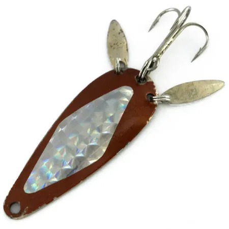 Ruskea emali peittää tämän 6 cm (2 1/4") lusikkauistimen etupuolen, jota korostaa keskellä oleva viisteinen, timanttikuvioinen heijastintarra, joka kerää valoa useista eri kulmista. Tämä yksilö edustaa Marathon Bait Companyn puolivälin vuosisadan käsityötaitoa; yritys oli Wisconsinin osavaltion peruspilari, joka toimi vuosina 1929–1979. Painoltaan 12 g (2/5 oz) uistimessa on erottuva «sonic blade» -rakenne, jossa kaksi pientä, soikeaa metallilevyä on kiinnitetty uistinrenkailla suoraan kolmihaarakoukun yläpuolelle lisävälkkeen luomiseksi. Kääntöpuolella puhdas nikkeliviimeistely on selkeästi leimattu «MARATHON»-nimellä, mikä vahvistaa sen alkuperän tuotekoodilla 9478. Kunnoltaan 5/5 oleva uistin osoittaa hyvin vähän ikääntymisen merkkejä; ruskea maali on säilynyt kirkkaana ja metalliosat kiiltävinä. Varustukseen kuuluu vankka kolmihaarakoukku ja valmiiksi porattu siimalenkki suippenevassa kärjessä, mikä on tyypillistä Marathonin viisikymmenvuotisen historian aikana USA:ssa valmistetuille monikäyttöisille uistimille.