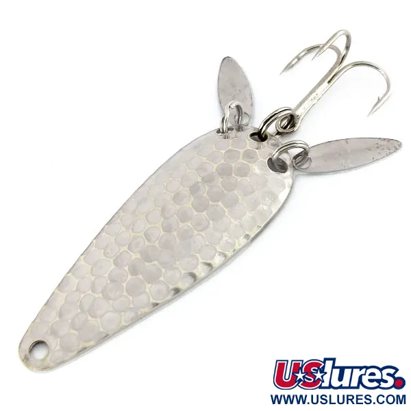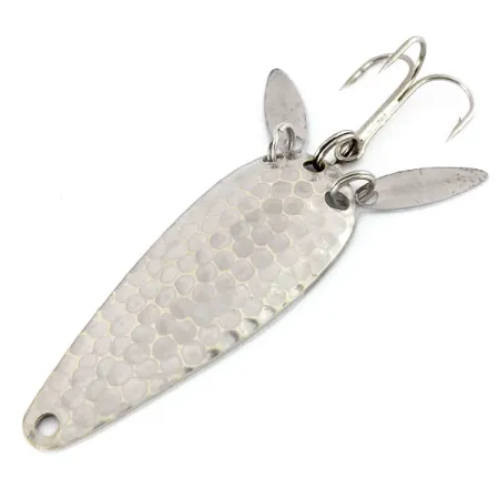 Vasaroitu nikkeli antaa tälle 12g (2/5oz) lusikalle koloisen pinnan, joka on suunniteltu vangitsemaan ja hajottamaan valoa tavalla, johon sileät metallipinnat eivät pysty. Wisconsinissa vuosina 1929–1979 toimineen Marathon Bait Companyn valmistama malli 9910 on pituudeltaan 6 cm (2 1/4"). Keskeinen tekninen ominaisuus on pari pieniä, pitkänomaisia äänilevyjä, jotka on kiinnitetty uistinrenkaisiin lähellä pyrstöä. Näillä levyillä on kaksi tarkoitusta: ne peittävät osittain terävän kolmihaarakoukun ja luovat toissajaisia visuaalisia välähdyksiä, joiden on tarkoitus jäljitellä syöttikalan pyrstön liikettä. Koveralla puolella on selkeä "MARATHON"-leima, joka kertoo sen alkuperän yhdestä Keskilännen tuotteliaimmista vuosisadan puolivälin kalastusvälinevalmistajista. Tämä yksilö on 5/5-kunnossa, ja siinä on kirkas, puhdas viimeistely sekä rungossa että lisäosissa. Pisaramainen profiili ja painonjakauma soveltuvat heitto- tai uistelutekniikoihin, joissa tarvitaan metallista siluettia.