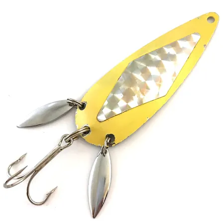 Tämä 7,5 cm (3") pituinen lusikkauistin erottuu kirkkaankeltaisella etupuolellaan, jota korostaa keskellä oleva holografinen timanttikuvio. Kolmihaarakoukun rinnalle on asennettu kaksi kiillotettua äänilevyä, jotka lisäävät visuaalista pinta-alaa ja kätkevät koukun taitavasti. Tässä 16 g (3/5 oz) uistimessa, tuotekoodi 5411, on kiillotettu nikkelitausta, jossa on selkeä Marathon-merkin leima. Wisconsinilaisen Marathon Bait Companyn (toiminnassa 1929–1979) valmistama metalli on erittäin siisti ja sen kuntoluokitus on 5/5. Alkuperäinen maali on säilynyt kirkkaana, tarjoten tehokkaan kontrastin hopeanväristen minilevyjen heijastuksille ja teksturoidun UV-osan prismamaiselle valolle.