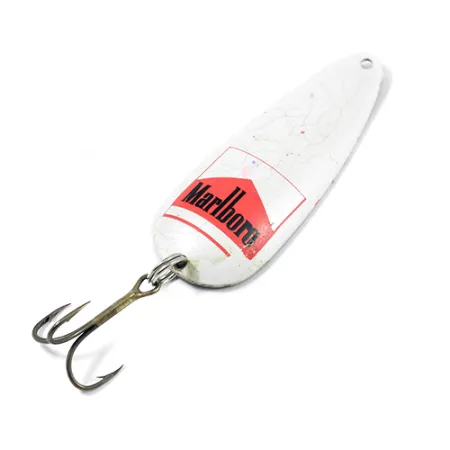 Klassinen 7 cm profiili määrittelee tämän stansatun metallilusikan, joka toimii ainutlaatuisena kalastusmuistoesineenä. Alun perin USA:ssa valmistettu tuote, tuotekoodiltaan 1964, sisältää helmivalkoisen viimeistelyn kuperalla puolella, jota hallitsee ikoninen punainen Marlboro-logo. Kääntöpuolella on kontrastia antava nikkelöinti, joka tarjoaa perinteiseltä lusikkauistimelta odotettua välkettä. 16 g painoisena se on riittävän vankka monipuoliseen heitto- tai vetouistelukäyttöön. Varustukseen kuuluu vintage-tyylinen kolmihaarakoukku, joka on kiinnitetty tukevalla uistinrenkaalla perään. Viehe on 3/5 kunnossa, ja siinä on aitoa kulumaa maalissa ja metallissa, mikä korostaa sen historiaa vesillä. Yksi kiinnityspiste päässä mahdollistaa helpon rigauksen siimaan tai perukkeeseen.
