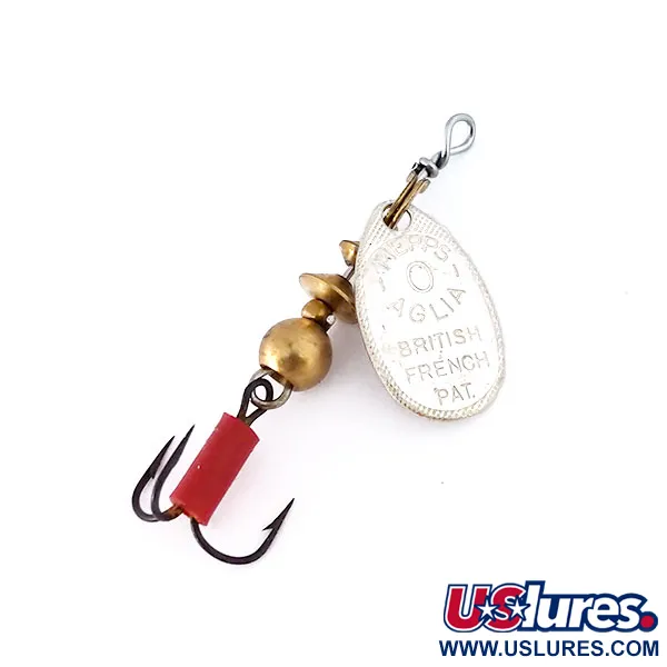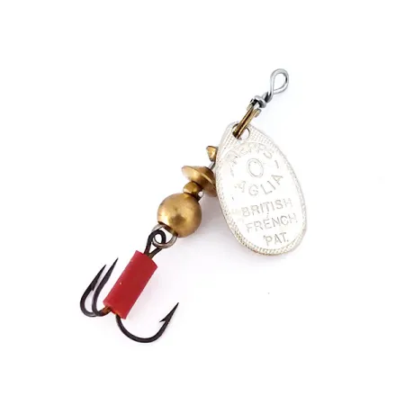 Hopeisen lehden leimaus paljastaa alkuperäiset "British French Pat." ja "Aglia" -merkinnät, jotka ovat suora yhteys Andre Meulnartin vuoden 1938 keksintöön. Tämä koon 0 yksilö painaa 2,5 g (3/32 oz) ja on pituudeltaan 4,5 cm (1 3/4"), ollen täydellinen valinta ultra-light-kalastukseen. Lehden kääntöpuolella on selkeä "Made in France" -merkintä, vaikka lippa on koottu USA:ssa. Runko koostuu messinkihelmistä ja painotetusta alaosasta, joka takaa vakauden sankakiinnitteiselle pyörimisjärjestelmälle. Huomionarvoinen yksityiskohta on kolmihaarakoukku, jossa on erottuva punainen muoviholkki iskupisteeksi taimenelle tai ahvenelle. 5/5-kunnossa oleva hopeointi on poikkeuksellisen kirkas ja messinkiosat ovat puhtaat, mikä kertoo huolellisesta säilytyksestä. Runkolanka on kierretty tiukasti silmukan kohdalta, osoittaen tuotekoodin 10339 edellyttämää kestävyyttä. Leveä lehti on suunniteltu pyörimään välittömästi kelauksen alkaessa, luoden tarvittavan vastuksen, jotta lippa toimii eri syvyyksissä.