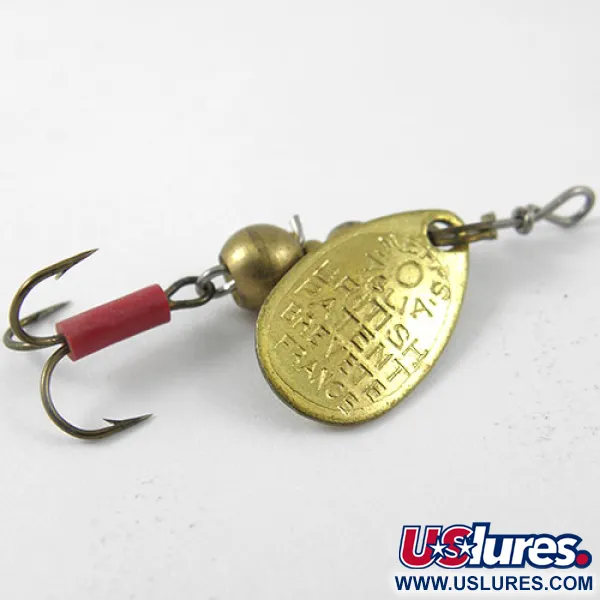 Messinkilehteen on selkeästi meistetty merkinnät "AGLIA" ja "BRITISH PATENT", mikä kertoo tämän koon 0 lipan historiallisesta eurooppalaisesta alkuperästä. Tuotekoodilla 1141 tunnistettu viehe painaa kevyet 1/16 oz (2,2 g) ja sen kokonaispituus on 1 1/2" (4 cm). Tässä yksilössä on klassinen messinkiviimeistely sekä lehdessä että keskusrungon painohelmissä. Kolmihaarakoukun varren päälle on asennettu kirkkaanpunainen holkki, jonka tarkoituksena on kohdistaa kalan huomio vieheen koukkupäähän. Komponentit on valmistettu Ranskassa, kuten "BREVETE"- ja "MADE IN FRANCE" -leimat osoittavat, vaikka lopullinen kokoonpano tapahtui Yhdysvalloissa. Kuntoluokitukseltaan 5/5 oleva viehe on käyttämätön ja täydellisessä kunnossa joko vitriiniin tai ultrakevyen kalastuksen liiveihin. Lehti on kiinnitetty yksinkertaisella messinkisellä lenkillä, joka on suunniteltu pyörimään vapaasti rungon ympäri tasaisessa kelauksessa.