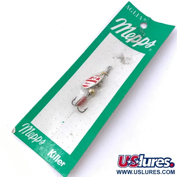 Klassisen puna-valkoraitainen koko 0 Aglian pieni lehti heijastaa Mepps-lippojen varhaisia amerikkalaisia muotoilumieltymyksiä. Vain 2,5 grammaa (3/32 oz) painava yksilö on loistava esimerkki Andre Meulnartin alkuperäisen vuoden 1938 ranskalaisen muotoilun tarjoamasta finess-lähestymistavasta taimenelle ja ahvenkaloille. Tämä uistin, tuotekoodiltaan 3924, on edelleen alkuperäisessä viher-valkoisessa ”Mepps Killer” -pakkauksessaan, jossa on Antigon, Wisconsinin osoite – kunnianosoitus Todd Sheldonin varhaisille jakelutoimille. Pituudeltaan 4,5 cm (1 3/4") kokonaisuuteen kuuluu puhdas messinginvärinen runko ja terävä kolmihaarakoukku. Myyntikortin kääntöpuolella on yhä vanha ”Save 25c” -kuponkitarjous Mepps Fisherman’s Guideen, joka maksoi aikoinaan vain 50 senttiä. Kuntoarvioltaan 6 oleva yksilö on käyttämätön ja säilynyt muovikuplassaan. Hopeoitu lehti on suunniteltu heijastamaan valoa, ja kartio-kierto mahdollistaa lehden pyörimisen jopa erittäin hitaalla kelauksella.