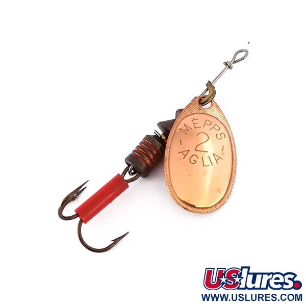 Kupari-lipan kääntöpuolelle on meistetty selkeä 'MADE IN FRANCE' -merkintä, mikä kertoo alkuperäisosien alkuperästä ennen niiden kokoonpanoa Yhdysvalloissa. Tämä Mepps Aglia 2, tuotekoodiltaan 10082, on välttämätön viehe taimenen ja ahvenen kalastajille. Painoltaan 4,5 g (3/16 oz) ja pituudeltaan 5,5 cm (2 1/4") oleva lippa on väritykseltään lämmin kupari. Runko-osa koostuu uritetusta messinginvärisestä painosta, jonka urissa on punaisia korostuksia, sekä sarjasta kartiomaisia helmiä, jotka mahdollistavat lipan vapaan pyörimisen lankasidoksessaan. Terävän kolmihaarakoukun varressa on erottuva punainen suojus, joka toimii iskupisteenä seuraavalle kalalle. Lipan etupuolelle on pakotettu 'MEPPS 2 AGLIA' -teksti, mikä osoittaa brändin tarkat valmistusstandardit. Kuntoluokitukseltaan 5/5 oleva viehe on metallipinnoiltaan kirkas ja runkolanka on suora. Leveän muotoilunsa ansiosta lippa alkaa pyöriä heti veteen osuessaan ja pitää tasaisen uintiliikkeen koko kelauksen ajan.