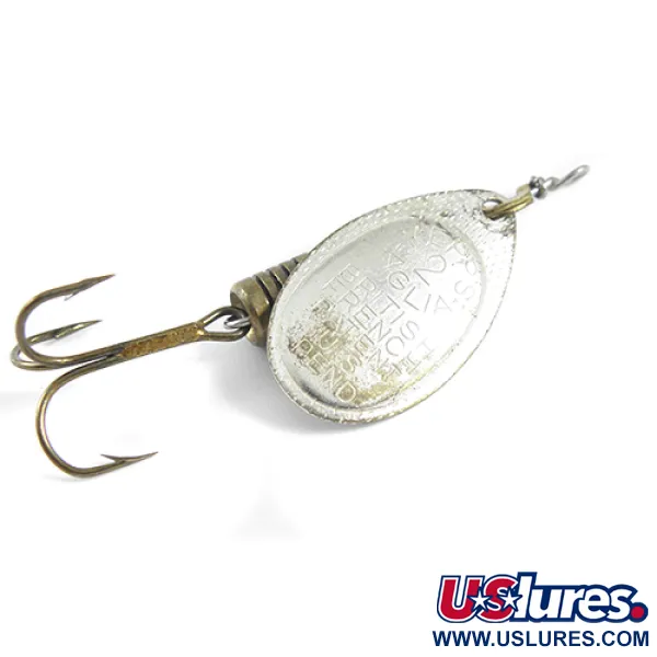 Hopeiseen lehteen on selvästi leimattu historialliset merkinnät sen ranskalaista ja brittiläistä alkuperää olevista patenteista sekä Yhdysvaltain vireillä olevasta patenttitilanteesta. Tämä Mepps Aglia 2, tuotekoodi 1777, painaa 3/16 oz (4,5 g) ja on kokonaispituudeltaan 2 1/4" (5,5 cm). Se on aito palanen urheilukalastuksen historiaa. Leveän lehden hopeointi tarjoaa klassisen välkkeen, jota täydentää painona ja painolastina toimiva porrastettu messinkirunko. Tämän uistimen rakenne kertoo vuosisadan puolivälin murroksesta, jolloin Mepps-komponentit valmistettiin Ranskassa ja koottiin sen jälkeen Yhdysvalloissa – yhteistyö, joka mullisti lippakalastuksen. Arvosanalla 4/5 varustettu yksilö on erittäin siisti, kolmihaarakoukku on pysynyt terävänä ja lankarunko suorana. Keräilijät arvostavat "AGLIA 2" -tekstin selkeyttä, mikä on osoitus aikakauden laadunvalvonnasta. Uistimessa on ikoninen kartiorotaatiojärjestelmä, joka mahdollistaa välittömän pyörimisen heti kelauksen alkaessa.