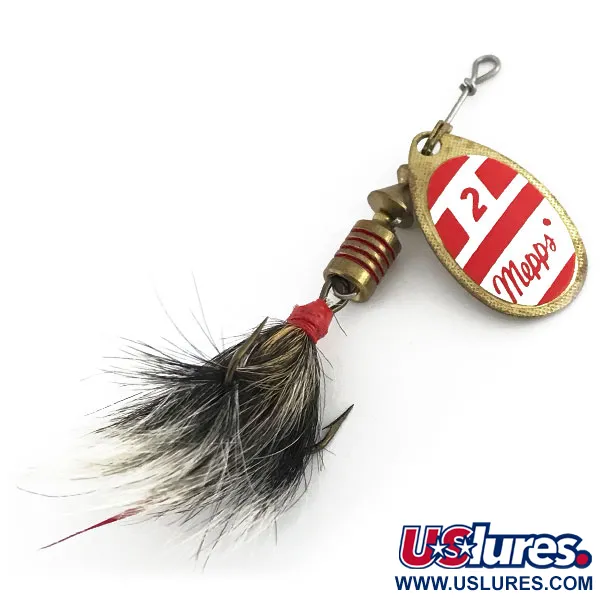 Punavalkoiset vinoraidat koristavat koon 2 messinkilippaa, tarjoten erinomaisen näkyvyyden ja kontrastin, joka on ollut Mepps-malliston peruspilari jo vuosikymmeniä. Lipan kääntöpuolella oleva ”MADE IN FRANCE” -leima vahvistaa tämän 8811-mallin pääkomponenttien alkuperän. Painoltaan 4,7 g (3/16 oz) ja pituudeltaan 5,5 cm (2 1/4") olevassa uistimessa on luonnonmukaisella oravan ja peuran karvalla sidottu koukku, joka on viimeistelty punaisella sidoslangalla ja erottuvalla punaisella kalkkunan sulalla. Messinkisessä runkopainossa on punaiset urat, jotka sointuvat lipan väritykseen. Tämä yksilö on käyttämätön ja 5/5-kunnossa: koukun kärjet ovat terävät ja messinkipinnat puhtaat. Runkolangan yläpäässä on siisti lenkki siiman kiinnittämistä varten, ja lippalenkki antaa lipan pyöriä vapaasti akselinsa ympäri.