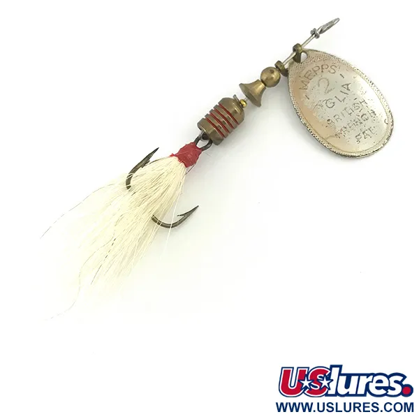 Hopeiseen lehteen on leimattu 'MEPPS 2 AGLIA' -tunnus sekä brittiläiset ja ranskalaiset patenttiviitteet, mikä heijastaa Andre Meulnartin vuoden 1938 muotoilun perintöä. Tämä 4,7 g (3/16 oz) painava ja 5,5 cm pitkä viehe sisältää messinkirungon, jonka keskipainoa korostavat neljä upotettua punaista rengasta. Koukkuna toimii valkoisella bucktail-karvalla sidottu kolmihaarakoukku, joka on viimeistelty tyvestä erottuvalla punaisella langalla. Tämän lipan osat on valmistettu Ranskassa ja koottu Yhdysvalloissa – käytäntö, joka vahvisti merkin asemaa Amerikan markkinoilla 1900-luvun puolivälissä. Tuotekoodilla 7292 varustettu viehe on 5/5-kunnossa; lehden pinta on kirkas ja karvoitus täysin ehjä. Leveä lehti on suunniteltu pyörimään välittömästi veteen osumisen jälkeen, mikä on Aglia-sarjan tekninen tavaramerkki.