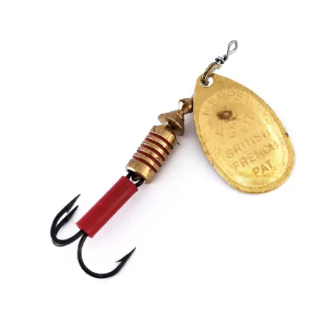 Kullattuun lehteen on leimattu selkeä 'British French Pat.' -merkintä, joka on osoitus tämän Mepps Aglia 3 -lipan pitkästä kansainvälisestä perinnöstä. Tämä 7g (1/4oz) painava ja 7cm (2 3/4") pitkä yksilö on varustettu kirkkaanpunaisella muoviholkilla kolmihaarakoukun varressa, mikä luo selvän visuaalisen kontrastin runkoon. Lehden kääntöpuolella on 'For Breck's Canada'- ja 'Made in France' -leimat, jotka kertovat sen jakelusta kanadalaisen maahantuojan kautta, joka auttoi popularisoimaan Andre Meulnartin vuoden 1938 mallia. Massiivimessinkinen runko on viimeistelty syvillä vaakaritilöillä, jotka antavat heittämiseen tarvittavan painon ja toimivat kartiomaisen sangan ankkurina. Tämän 5/5-kuntoisen lipan jokainen osa messingisestä runkolangasta kiillotettuun kultaukseen heijastaa kestävää rakennetta, joka teki näistä lipoista maailmanlaajuisia standardeja. Tuotekoodi 10079 edustaa keskikokoista Aglia-mallia, jota käytetään usein suuremman taimenen, ahvenen tai hauen kalastukseen.
