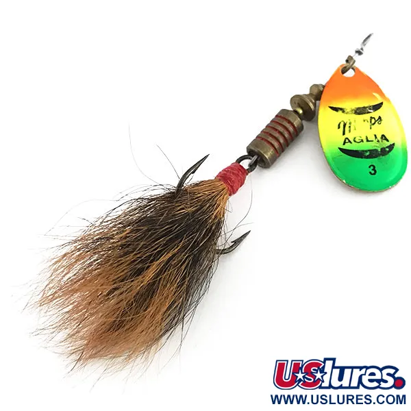 Eloisa oranssin, keltaisen ja vihreän kolmivärinen liukuvärjäys koristaa tämän koon 3 lipan lehteä, jossa on korkean näkyvyyden takaava fluoresoiva UV-viimeistely. Painoltaan 4,7 g (3/16 oz) oleva Mepps Aglia 3 dressed UV sisältää klassisen ranskalaisvalmisteisen lehden, jonka etupuolelle on stanssattu "Mepps Aglia 3" ja kääntöpuolelle "Made in France". Tämä nimenomainen yksilö, tuotekoodiltaan 8812, on pituudeltaan 5,5 cm (2 1/4") silmukasta kolmihaarakoukun mutkaan. Itse koukku on varustettu käsin sidotulla luonnonmukaisella oravan- ja peuran-karvatupsulla, joka on kiinnitetty erottuvalla punaisella lankasidoksella luonnollisen profiilin ja hienovaraisen väreilyn luomiseksi kelauksen aikana. Messinkirunko koostuu sarjasta päällekkäisiä helmiä ja sangosta, joka mahdollistaa lehden tasaisen pyörimisen veteen osuessa. Komponentit edustavat ranskalaisen insinööritaidon ja amerikkalaisen kokoonpanon yhteistyötä, ja malli on ollut osa Wisconsinissa toimivan Mepps US -valikoiman peruspilaria 1960-luvulta lähtien. Vieheessä on vain lieviä käytön jälkiä ja se on vankassa 4/5-kunnossa; merkinnät ovat selkeät ja karvatupsu on hyvin säilynyt. Lehden kääntöpuoli paljastaa Aglia-sarjalle tyypillisen kiillotetun kullanvärisen metallin, joka luo kontrastin etupuolen kirkkaille väreille.