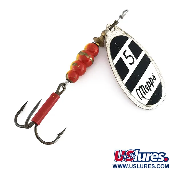 Massiivinen 8 cm profiili tekee tästä koon 5 lipasta (tuotekoodi 8045) todellisen täsmäaseen suurille hauille ja muskieille. 14 gramman paino keskittyy messinkirunkoon ja neljään selkeään puna-keltaiseen helmeen. Suuri hopeinen lippa on koristeltu korkeakontrastisella mustavalkoisella vinokuviolla, jonka keskellä on ikoninen numero "5" ja Mepps-teksti. Lipan kääntöpuolelta löytyy aito "MADE IN FRANCE" -leima, mikä on merkki USA:ssa kootun vieheen laadukkaista osista. Toimivasta päästä löytyy terävä kolmihaarakoukku, jonka vartta suojaa perinteinen punainen kutisteletku. Kevyitä käytön jälkiä lukuun ottamatta helmien ja hopealipan pinnoite on 4/5-kunnossa. Kartionmuotoinen pyörintäjärjestelmä on suunniteltu tarjoamaan tasainen liike ja ne ominaiset värinät, joista tämä malli tunnetaan.