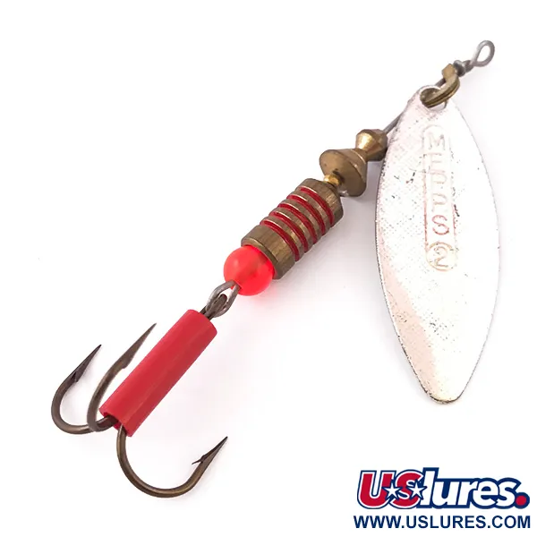 1/4 unssin (7,4 g) paino jakautuu uritetun messinkirungon läpi, jossa syvänpunaiset väriaksentit urissa luovat visuaalista kontrastia. Pituudeltaan 2 3/4" (7 cm) siimalenkistä koukun mutkaan oleva Mepps Aglia Long 2 on varustettu korkealaatuisilla, Ranskassa valmistetuilla ja USA:ssa kootuilla komponenteilla. Pitkänomainen pajunlehtilippa on viimeistelty kirkkaalla nikkelillä ja siinä on selkeä leima, josta ilmenee alkuperä ja mallikoko. Tuotekoodia 3981 dokumentoivat keräilijät arvostavat alkuperäisten osien säilyvyyttä, mukaan lukien koukun silmän yläpuolella oleva läpikuultava punainen helmi. Tämä yksilö on 5/5-kunnossa, siisteillä metallipinnoilla ja suoralla runkolangalla. Pronssiviimeistelty kolmihaarakoukku on tehdasterävä ja varustettu klassisella punaisella iskuhoukuttimella varressa.