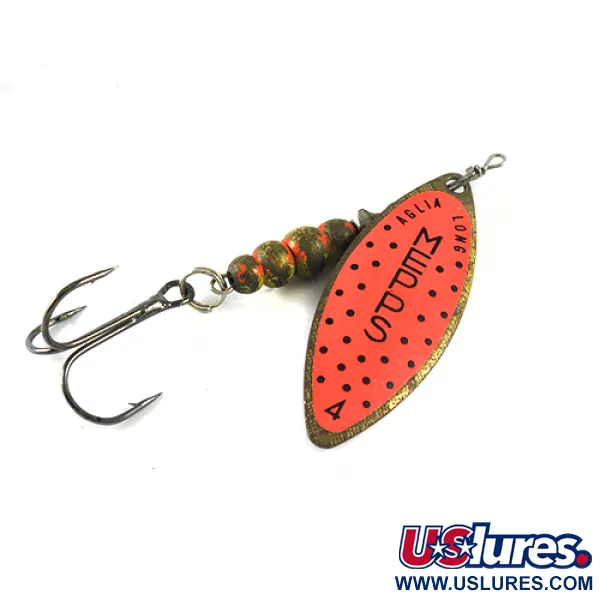 Tämä 17 g (3/5 oz) painava klassikkolippa on rakennettu ikonisen pajunlehtilipan ympärille, joka on Aglia Long -sarjan tunnusmerkki. Lipassa on kirkas loistava oranssi etupuoli mustilla pisteillä ja klassinen Mepps-brändäys, mukaan lukien tyveen stanssattu koko 4. Tuotekoodi 1703 edustaa palaa kalastushistoriaa; sen osat on valmistettu Ranskassa ja se on koottu Yhdysvalloissa. Painotettu runko koostuu kuvioiduista helmistä, jotka on viimeistelty maanläheisellä vihreällä ja oranssilla maastokuvioinnilla, päättyen terävään kolmihaarakoukkuun. Messinginvärinen runko on pituudeltaan 8 cm (3 1/4") ja se tarjoaa riittävästi painoa heittoihin tai syvän veden kalastukseen. Tämä yksilö on 4/5-kunnossa, pinta on hyvin säilynyt ja metallipinnat ovat puhtaat.