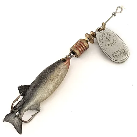 Numero 1:llä ja Comet-nimellä leimattu hopeinen lehti on klassinen ranskalaisvalmisteinen komponentti, joka on yhdistetty realistiseen kumikalaan. Tuotekoodilla 13127 luetteloitu Mepps Comet Mino 1 painaa 4,6 g (3/16 oz) ja on perusvaruste kevytkalastusvälineiden keräilijöille. Hopeapintainen lehti pyörii tukevassa lankarungossa, joka johtaa painotettuun messinkirunkoon, jossa on kolme erottuvaa punaista uraa. Pituudeltaan 8 cm (3 1/4") etulenkillä varustettu uistin jäljittelee pikkukalaa, jolla on tumma suomuinen selkä ja vaalea vatsa, jossa on ripaus punaista kurkussa. Nämä USA:ssa alkuperäisistä ranskalaisista osista kootut osat ovat upeassa kunnossa, mistä osoituksena on 5/5-kuntoluokitus sekä metalli- että kumiosille. Yksi kolmihaarakoukku on integroitu kalan takaosan profiiliin virtaviivaisen muodon säilyttämiseksi.
