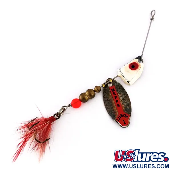 Messinginvärinen lippa, jossa on huomattava punainen tarra 'MEPPS LUSOX 1' -tekstillä, yksilöi tämän Yhdysvalloissa valmistetun yksilön. Pituudeltaan 7,5 cm (3") ja painoltaan 10 g (1/3 oz), rakenne perustuu kestävään teräslankaan. Kokoonpano sisältää mustavalkoiseksi viimeistellyn painopään selkeällä punaisella silmällä, jota seuraa kolme messinkihelmeä ja kirkkaan oranssi välihelmi. Taakse on kiinnitetty punainen höyhenkolmikoukku, joka lisää pehmeän visuaalisen elementin metalliseen profiiliin. Kuntoluokituksella 4/5, maalatut yksityiskohdat ja metallipinnat ovat säilyneet hyvin, näyttäen vain lieviä iän merkkejä. Tämä malli, tuotekoodi 10198, hyödyntää Lusox-sarjalle ominaista klassista vaihdettavaa painopäätä, joka on suunniteltu auttamaan esittelyssä eri syvyyksissä.