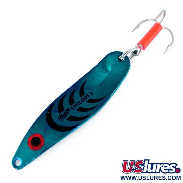 Tässä 7,5 cm (3 tuumaa) pitkässä uistimessa on Syclops-sarjalle ominainen S-muotoinen profiili. Metallinhohtoinen sininen viimeistely peittää kuperan puolen, jota koristelevat mustat suomukuviot ja punainen silmä. Koveralla puolella on kiillotettu hopea, johon on lyöty Mepps Syclops 2 -logo, 17 g paino ja ”Made in France” -merkintä. Tuotekoodi 10008, kuntoarvio 5/5, ei käytön jälkiä maalipinnassa tai koukuissa. Standardi kolmihaarautuva koukku on kiinnitetty uistinrenkaalla ja varustettu punaisella iskupisteellä. Kaikki metallipinnat ovat kirkkaita ja heijastavia.