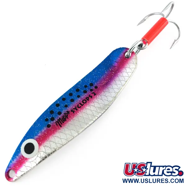 Tässä klassisella taimenkuviolla koristellussa S-muotoisessa lusikkauistimessa on selkeä liukuvärjäys sinisestä vaaleanpunaiseen yläreunaa pitkin. Hopeasuomuista alaosaa korostavat mustat pisteet, jotka päättyvät näkyvään mustavalkoiseen silmään siiman kiinnityspisteen lähellä. Kääntöpuolella kiillotettuun metalliin on selkeästi meistetty "MADE IN FRANCE" sekä Mepps Syclops -brändi ja paino 17 g (3/5 oz). Pituudeltaan 7,5 cm oleva viehe kantaa tuotekoodia 8923 ja on erinomaisessa 5/5-kunnossa. Koukutuksena on terävä kolmihaarakoukku, jonka varressa on kirkkaanpunainen iskupiste-putki. Tämä koon 2 malli edustaa ranskalaisten kalastusvälineiden tyypillistä tarkkuustyötä.