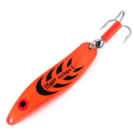Tämä 7,5 cm pitkä lusikkauistin on väriltään eloisa Orange, ja sen muotoilu on optimoitu näkyvyyteen vaihtelevissa valo-olosuhteissa. 17 gramman runkoon on leimattu "Mepps syclops 2" -allekirjoitus, ja sitä korostavat mustat puolikuun muotoiset kuviot. UV-valossa pinnoite antaa voimakkaan punertavan oranssin hehkun, kuten pimeäkenttävalokuvassa näkyy, mikä auttaa näkyvyyttä syvemmissä vesikerroksissa. Punainen holkki peittää kolmihaarakoukun varren tarjoten hienovaraisen iskupisteen rungon takana. Tämän tuotekoodilla 9787 luetteloidun yksilön viimeistely ja koukut ovat 5/5-kunnossa, säilyttäen tehtaan maalin alkuperäisen kiillon ja musta-punaisen silmän tarkat yksityiskohdat.