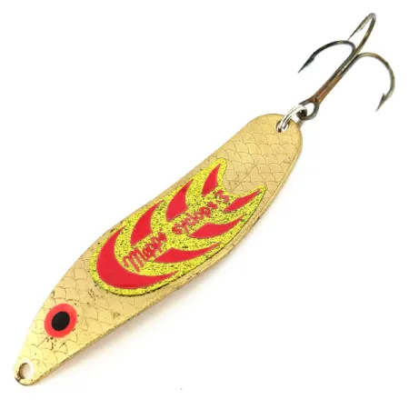 Tämä 26g (1oz) painoinen lusikkauistin on suunniteltu pitkiin heittoihin ja syvällä kalastamiseen. Kultapintaisessa rungossa on puristettu suomukuvio, joka heijastaa valoa koko 9cm (3 1/2") pituudeltaan. Tuotekoodilla 9642 tunnistettava Mepps Syclops 3 on klassinen esimerkki ranskalaisesta suunnittelusta Amerikan markkinoille. Kuperan puolen kirkas puna-keltainen kuviointi palvelee kahta tarkoitusta: keltainen pigmentti on fosforoiva, mikä parantaa näkyvyyttä syvissä tai sameissa vesissä. Silmiinpistävä puna-musta silmä lähellä siiman kiinnityspistettä tarjoaa korkean kontrastin iskupisteen kalalle. Yleiskunto on kirkas ja erinomaisesti säilynyt, ansaiten 5/5-luokituksen. Uistin on varustettu kestävällä kolmihaarakoukulla ja vahvalla uistinrenkaalla.