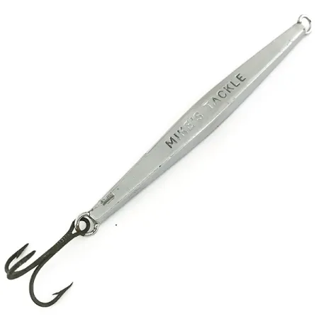 Tämä metallinen pystypilkki, jonka vastakkaisille tasaisille sivuille on leimattu "MIKE'S TACKLE" ja "SLIM JIM", edustaa klassista kapeaa profiilia, joka on suunniteltu pystykalastukseen. Painoltaan 44 g (1 1/2 oz) ja pituudeltaan 10 cm (4"), siinä on riittävästi massaa saavuttamaan syvyyden nopeasti. Nikkeli-viimeistely antaa erittäin heijastavan pinnan, mikä on perinteinen valinta syöttikalan jäljittelyyn eri valaistusolosuhteissa. Arvosanalla 4/5 varustettu yksilö säilyttää kirkkaan heijastavuutensa koko pitkänomaisella rungollaan, ja siinä on vain vähäisiä merkkejä historiastaan. Siinä on yksinkertainen mutta tehokas muotoilu, jossa on vankka uistinrenkaalla kiinnitetty kolmihaarakoukku ja kestävä kiinnityssilmukka päässä. Tämä Mike's Tackle -viehe, tuotekoodiltaan 6849, on täydellinen esimerkki vuosisadan puolivälin amerikkalaisesta metalliuistimien valmistuksesta.