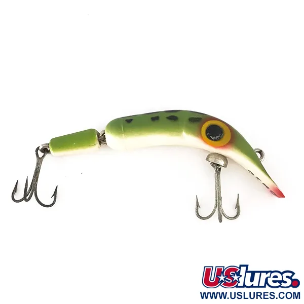 Tämä Mill Run Beno on klassinen esimerkki vuosisadan puolivälin amerikkalaisesta viehesuunnittelusta, ja siinä on perinteinen Frog-väritys tummilla täplillä vihreän selän päällä. Nivelletty 8 cm runko koostuu kahdesta osasta, mikä antaa sille omaleimaisen profiilin matalissa ja keskisyvissä vesissä kalastamiseen. Tuotekoodi 7846 kuuluu tälle yksilölle, joka painaa monikäyttöiset 7 g. Punainen uintilevy luo jyrkän visuaalisen kontrastin luonnonvalkoista vatsaa vasten, ja suuret kelta-mustat silmät on sijoitettu eteenpäin kaarevaan pääosaan. Koukutus on varmistettu metallilevyillä ja ruuvisilmukoilla, jotka pitävät kaksi kolmihaarakoukkua tukevasti paikoillaan. Tämä viehe on erittäin hyvin säilynyt ja ansaitsee kuntoarvosanan 5/5 maalipinnan selkeyden ja metalliosien puhtauden ansiosta.