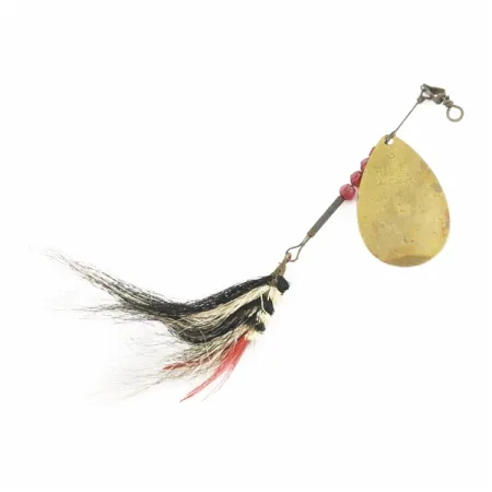 Kiillotettu messinki antaa tämän Miller #3 MFG Springwater -lipan pisaranmuotoiselle lehdelle klassisen välkkeen. Vieheen pituus on 10 cm (4") ja paino 7 g (1/4 oz), mikä mahdollistaa tarkat heitot. Kolme läpikuultavaa punaista särmikästä helmeä luovat visuaalisen kontrastin lanka-akselia ja messinkiosia vasten. Tämä tuotekoodilla 24496 tunnettu lippa edustaa Miller Fishing Lure Co:n käsityötaitoa vuodesta 1929. Koukussa on tuuhea mustavalkoinen karvasidos, joka on viimeistelty kirkkaanpunaisella höyhenellä. Yleiskunto on erittäin hyvä (4/5). Metallinen väliholkki erottaa helmet silmukasta varmistaen, että lehti pyörii esteettömästi akselin ympäri.
