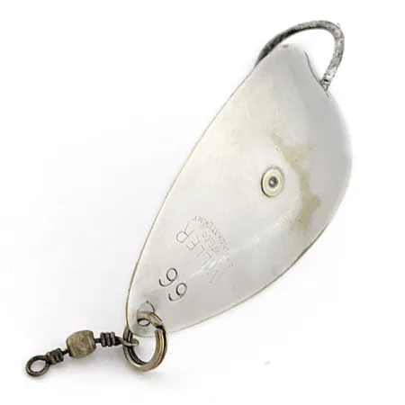 Kääntöpuolen metalliin on stanssattu 'Miller 66' -tunniste ja valmistusmaa USA. Hopeointi heijastaa valoa tässä 5,5 cm (2 1/4") pituisessa amerikkalaisvalmisteisessa lusikkauistimessa, joka painaa monikäyttöiset 7 g (1/4 oz). Harvinaisuudeksi vintage-kalastusvälineiden maailmassa luokitellussa yksilössä on runkoon tukevasti kiinnitetty suuri yksihaarakoukku. Kunto on hyvin säilynyt 4/5; pinnassa on vain vähäisiä iän tuomia merkkejä, ja kiiltävä, heijastava pinta on säilynyt. Varustukseen kuuluu vankka uistinrengas ja alkuperäinen tynnyrileikari, ja se soveltuu niin heitto- kuin vetouisteluun. Tuotekoodilla 22949 tunnistettavalle uistimelle on ominaista keskiniittirakenne, joka oli Millerin kestävän muotoilun tavaramerkki. Koukun metalli on tummunut hieman ajan myötä, mikä luo selkeän visuaalisen kontrastin kiillotetulle rungolle.