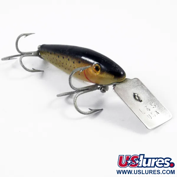 Tämä pieni uppoava uistin, jonka neliönmuotoiseen metallilippaan on meistetty teksti "L&S USA", edustaa L&S Bait Companyn klassista amerikkalaista uistinsuunnittelua. MirrOlure on 4 cm (1 1/2") pitkä ja painaa 2,5 g (3/32 oz). Siinä on taimenväritys, jossa tummanharmaa selkä vaihtuu kullaneltaisiksi kyljiksi. Hieno musta pisteytys peittää sivut, ja silmän takana oleva punainen kaareva viiva simuloi kidusta. Tämä yksilö on 5/5-kunnossa, ja sekä maali että osat ovat säilyneet erinomaisesti. Uintilevy on kiinnitetty kahdella ruuvilla, mikä antaa uppoavalle, hauelle ja kuhalle suunnatulle uistimelle tarvittavan painotuksen. Varustukseen kuuluu kaksi mattapintaista kolmihaarakoukkua, mikä heijastaa 1900-luvun puolivälin Yhdysvaltain valmistukselle tyypillistä käytännönläheistä muotoilua.