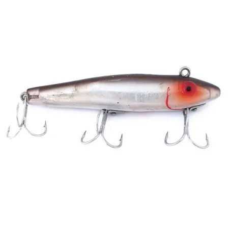 1/2 oz:n (14 g) paino antaa tälle L&S Bait MirrOlure 52M 27 Original -vieheelle uppoavalle twitchbaitille ominaisen tiheyden, jota tarvitaan syvempien vesikerrosten saavuttamiseen. Tuotekoodilla 10997 tunnistettavassa vieheessä on M27-väriprofiili, joka koostuu hopeasuomuisesta rungosta, tummasta selästä ja näkyvästä punaisesta pääosasta tummalla pupillilla. Vieheen pituus on 3 3/4 tuumaa (9,5 cm), ja siinä on kolme hopeanväristä kolmihaarakoukkua, jotka on kiinnitetty kestävällä ruuvi-ja-levy-mekanismilla, mikä on tyypillistä 1900-luvun puolivälin yhdysvaltalaiselle valmistukselle. Vatsassa on selkeä punainen '52M27'-leima, joka erottuu terävästi vaaleaa alaosaa vasten. Tämä yksilö on 4/5-kunnossa, ja siinä on erittäin vähäisiä iän tuomia merkkejä, mutta muovirunko on edelleen sileä ja puhdas. Suunniteltu sekä heitto- että uisteluun, se on alun perin rakennettu kestämään lohen, hauen ja valkosilmäkuhan aggressiiviset iskut. Siimalenkki sijaitsee pään päällä helpottamaan sen uppoamisasentoa kelauksen aikana.