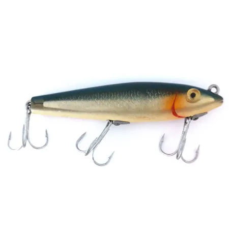 Suomukuvioidut kyljet täyteläisellä kultaisella viimeistelyllä määrittelevät tämän USA:sta peräisin olevan klassisen L&S Bait Mirrolure 7M24 -pintauistimen ulkonäön. 11 cm (4 1/4") pituinen ja 11 g (2/5 oz) painoinen malli on varustettu syvän sinivihreällä selällä, joka vaihtuu kuvioiduiksi metallikyljiksi, joita korostaa kirkkaanpunainen kidusmerkki pään lähellä. Suuret, silmiinpistävät keltaiset silmät sijaitsevat aivan yläpuolisen siimalenkin alapuolella, mikä on tyypillinen piirre 7M-sarjan pintauistimille. Varustettu kolmella terävällä kolmihaarakoukulla, joiden pinta on säilynyt kirkkaana. Tuotekoodilla 10990 varustettu yksilö on erinomaisessa kunnossa (luokitus 5/5). Keräilijät arvostavat M24-värikuviota, joka on klassikko ahvenen, hauen ja taimenen kalastuksessa heittäen tai uistellen. Sen solakka, sikarimainen profiili on suunniteltu pysymään aivan veden pinnassa.